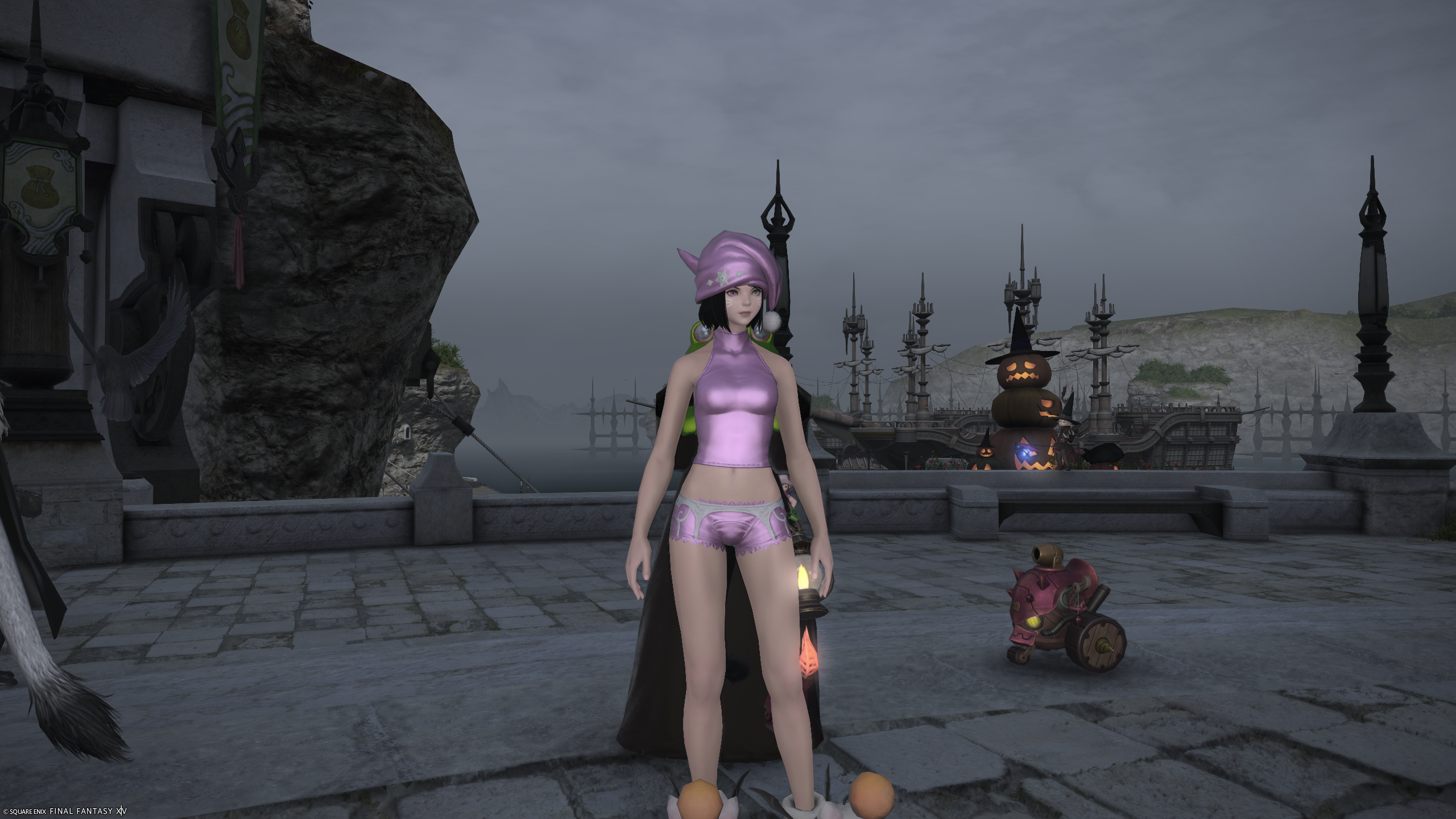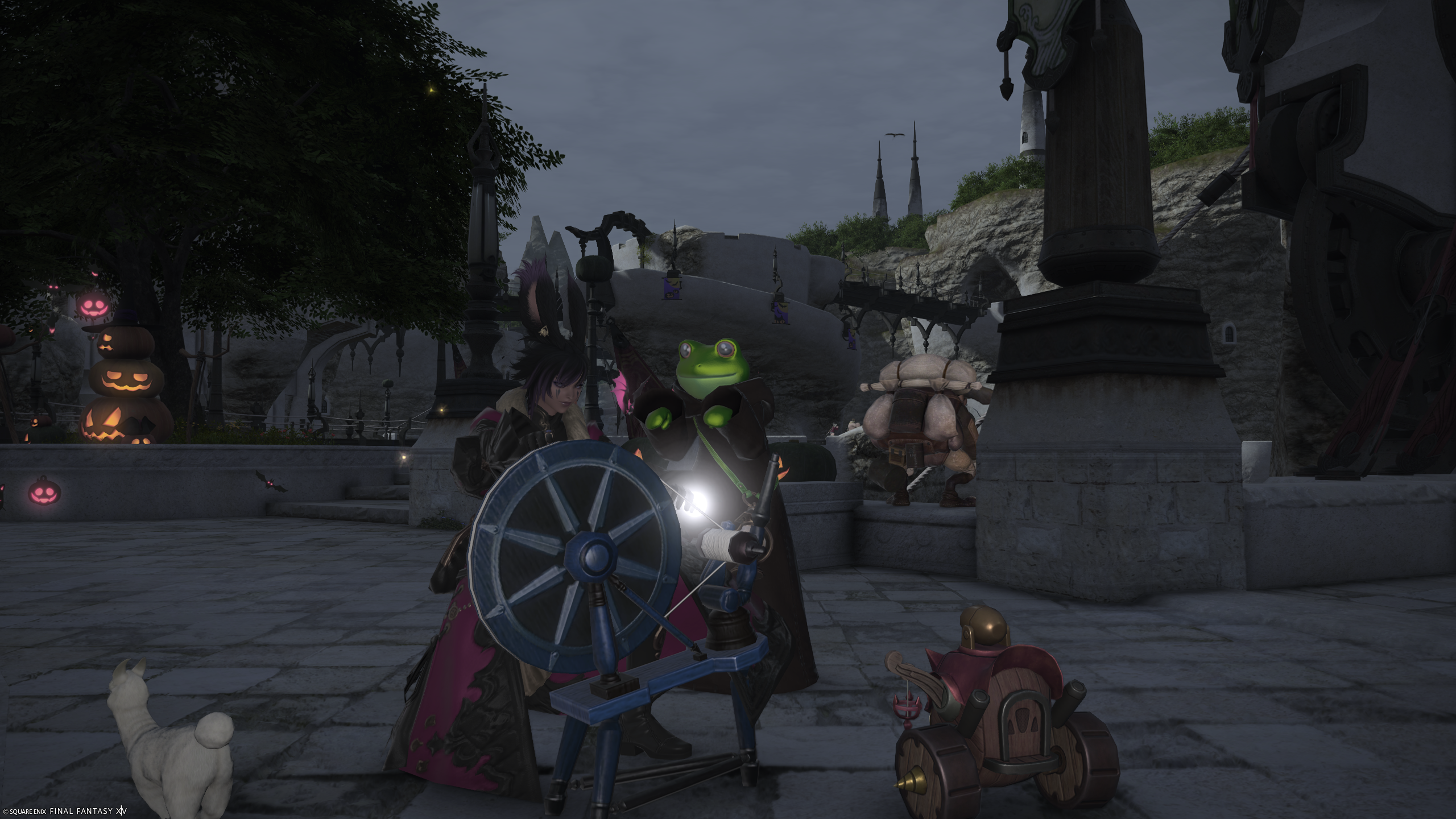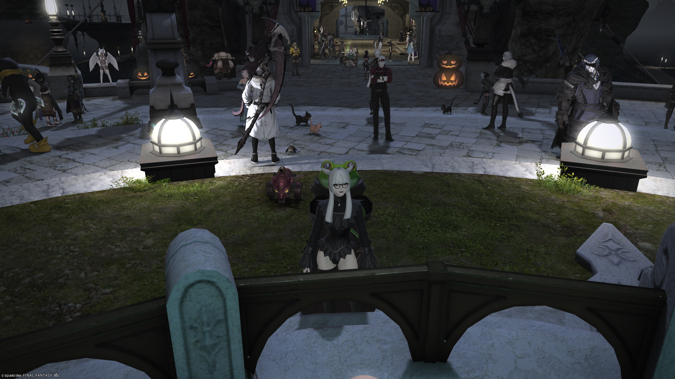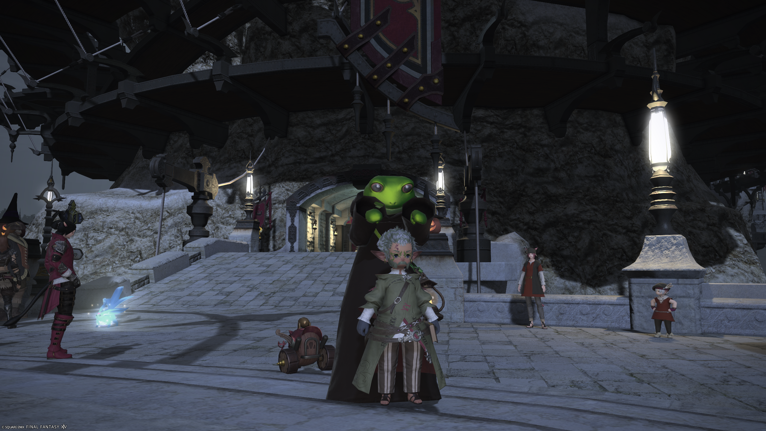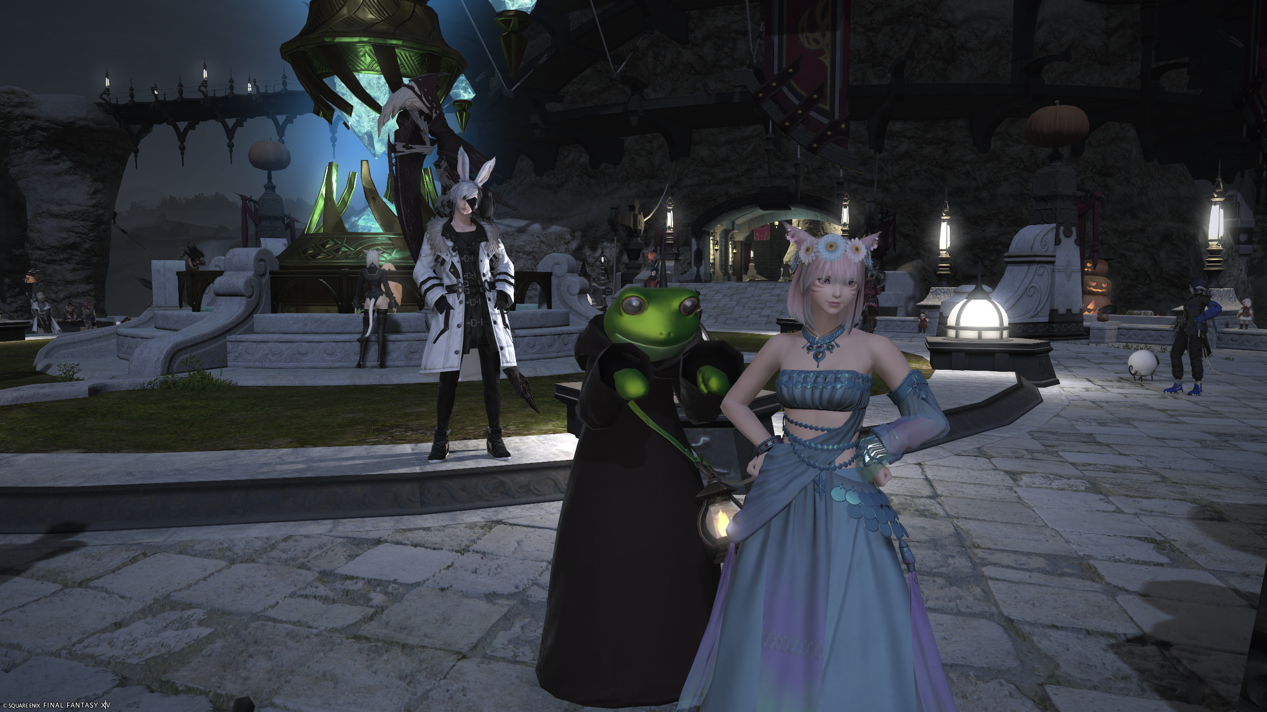 Silly frog costume I used to menace folks in Limsa Lominsa's Aetheryte Plaza for Halloween 2025.
